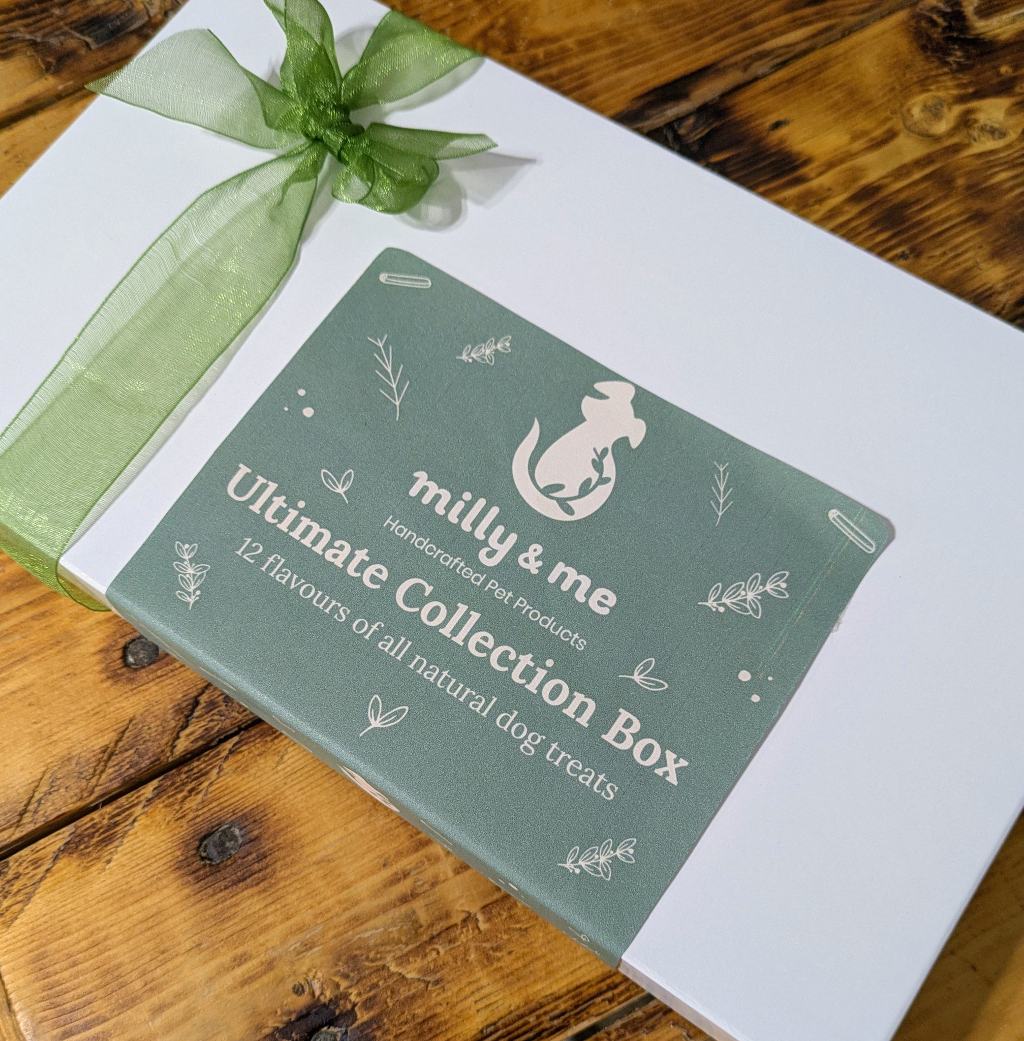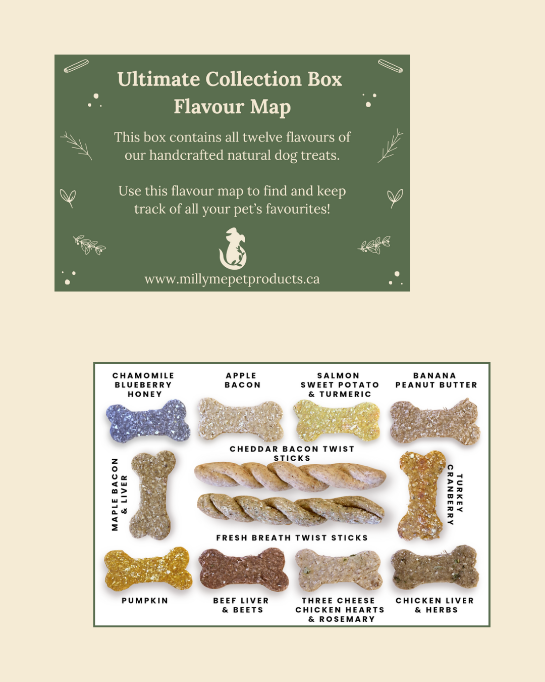The Ultimate Collection Box is filled with all twelve flavours of our handcrafted natural dog treats and a fun flavour map for you to find and keep track of all your pet's favourites!